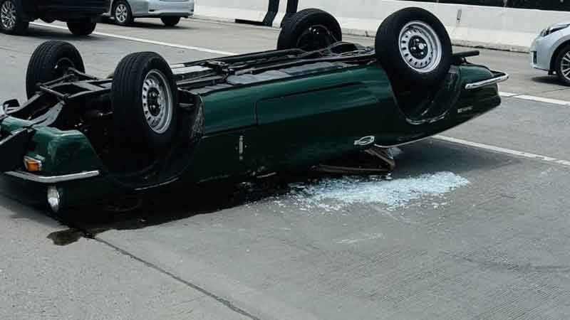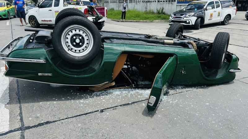 รถสปอร์ตหรู เปิดประทุน สุดคลาสสิก เสียหลักหงายท้องล้อชี้ฟ้า พังเสียหาย