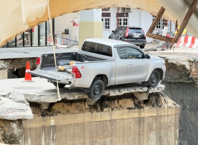 ส่องป้ายทะเบียนรถกระบะ รอดหวุดหวิด ถนนทรุดหน้ารพ.วชิรพยาบาล!