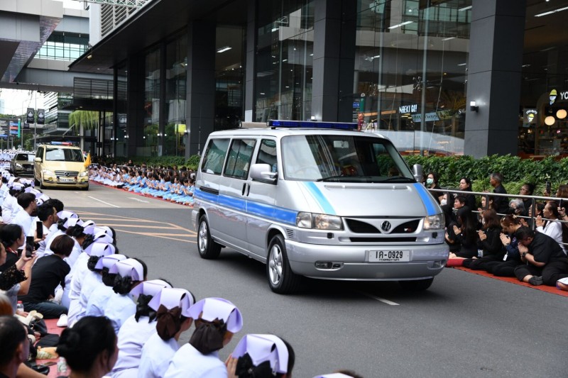 เมื่อขบวนรถเชิญพระบรมศพ เคลื่อนออกจากหน้าอาคารภูมิสิริมังคลานุสรณ์ คณะแพทย์ พยาบาล เจ้าหน้าที่ พร้อมด้วยนิสิตแพทย์ นักศึกษาพยาบาลโรงพยาบาลจุฬาลงกรณ์ สภากาชาดไทย และประชาชน พร้อมใจกันก้มกราบแสดงความอาลัยถวาย และร่ำไห้