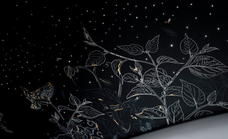 เพดาน Starlight Headliner: ปักด้วยเส้นด้ายกว่า 440,000 เข็ม เป็นภาพต้นหม่อน (Mulberry Tree) จากสวนของ Sir Henry Royce พร้อมผึ้งและนกเล็ก