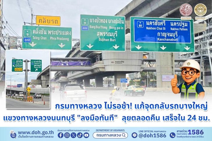 การแก้ไขโดยเร่งด่วน: แขวงทางหลวงนนทบุรี กรมทางหลวง ได้เร่งดำเนินการแก้ไขปัญหาจราจรและติดตั้งป้ายแนะนำจุดกลับรถใหม่ตลอดคืน และแล้วเสร็จภายใน 24 ชั่วโมง เพื่ออำนวยความสะดวกให้ผู้ใช้รถใช้ถนน