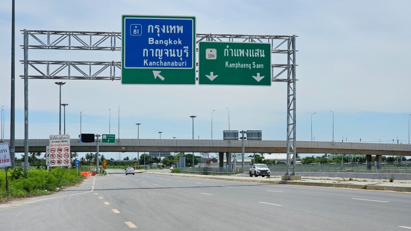 เข้าสู่เส้นทางหลัก: ชี้ทางไป ทล.9 (บางบัวทอง-บางปะอิน/สุพรรณบุรี) หรือ มอเตอร์เวย์ M81 (นครชัยศรี/นครปฐม/กาญจนบุรี)